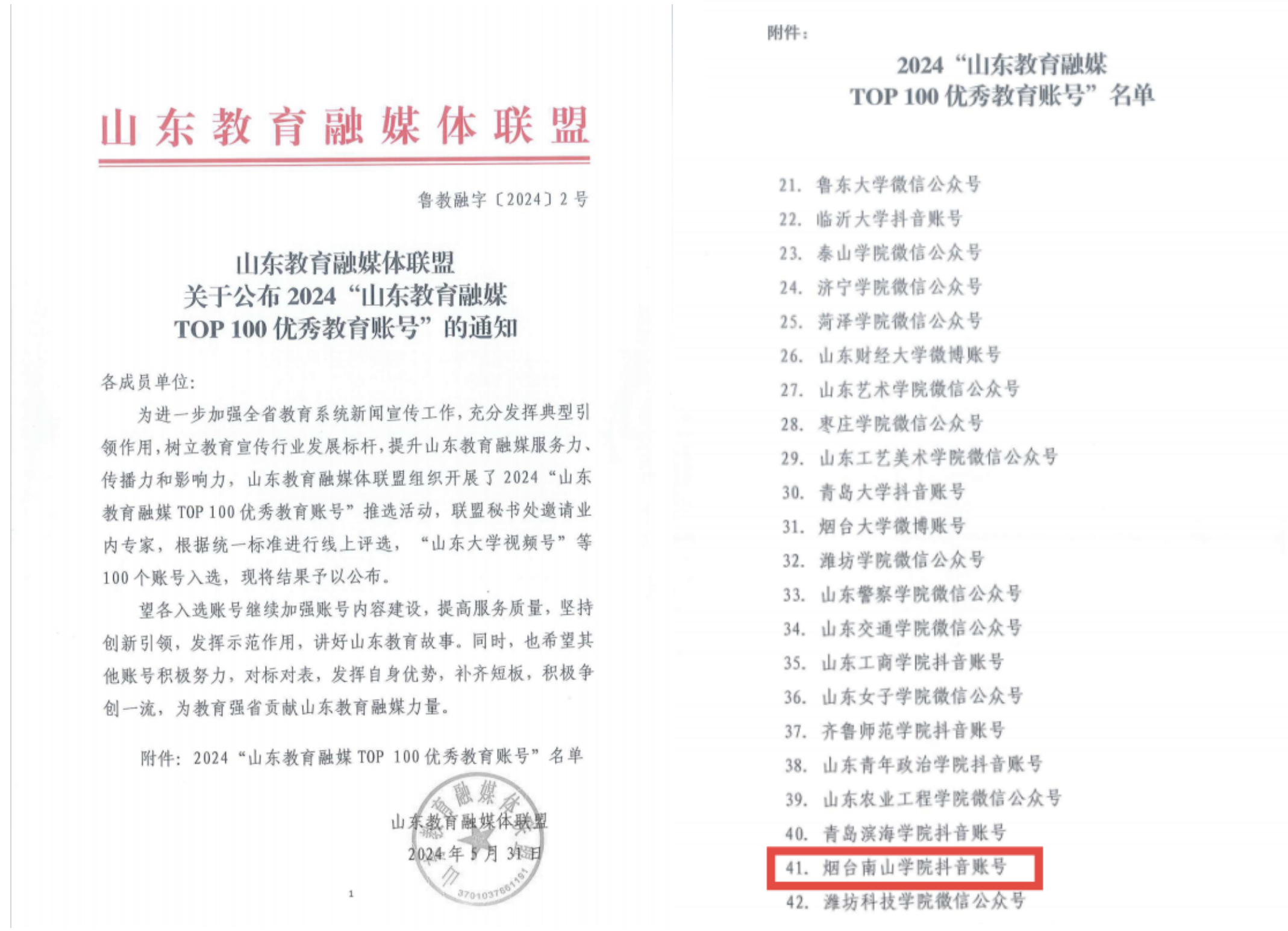 烟台南山学院荣获2024“山东教育融媒TOP100优秀教育账号”