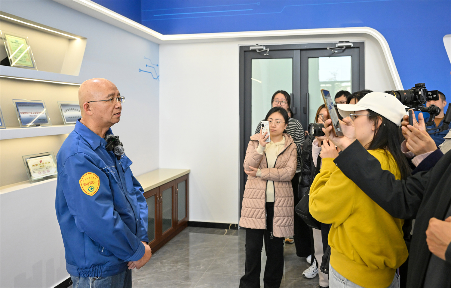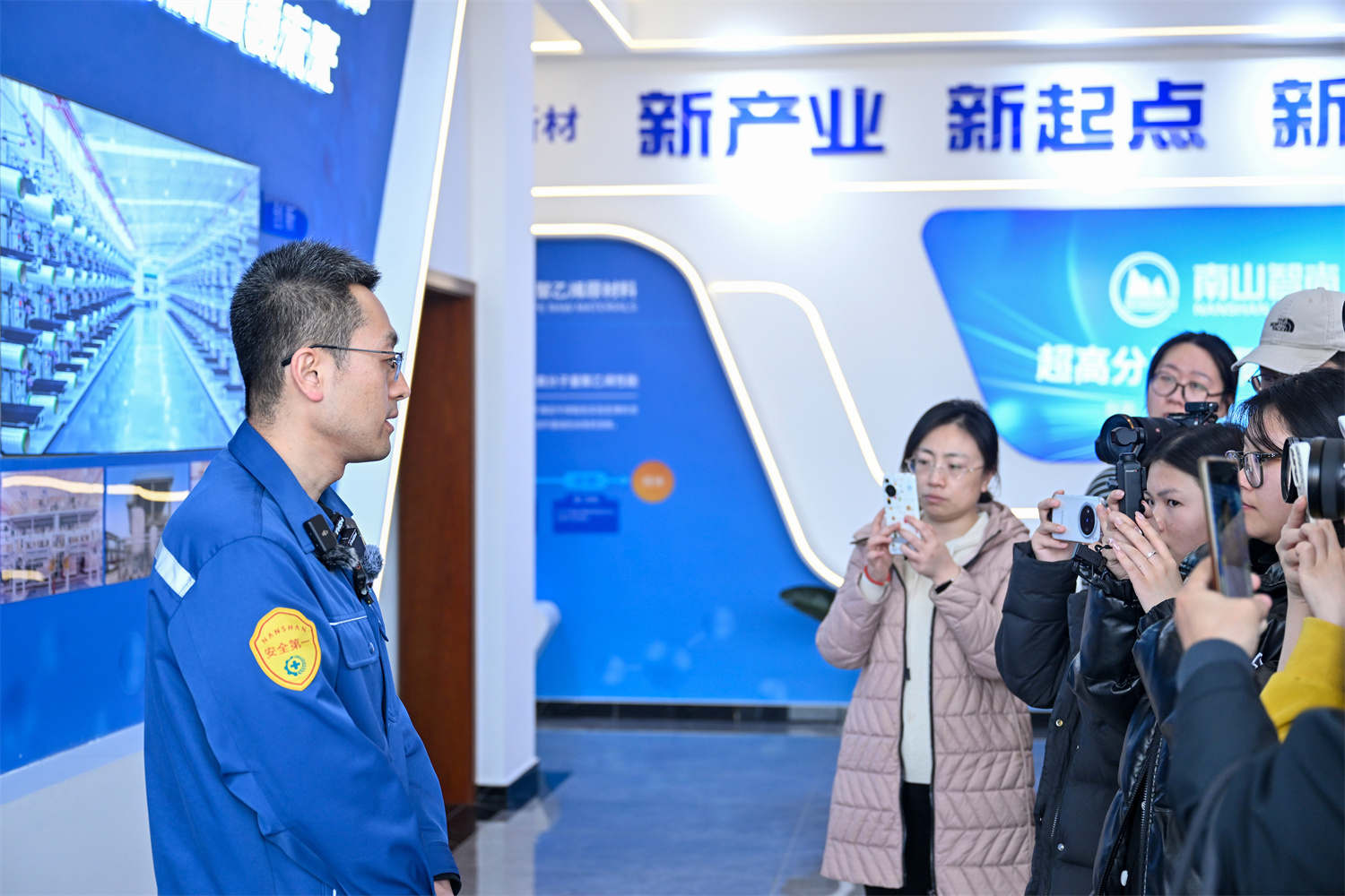 南山智尚超高分子量聚乙烯公司副总经理韩皞,带领记者们近距离参观、体验超高展品,并就记者问题详细介绍了3600吨超高分子量聚乙烯纤维项目。