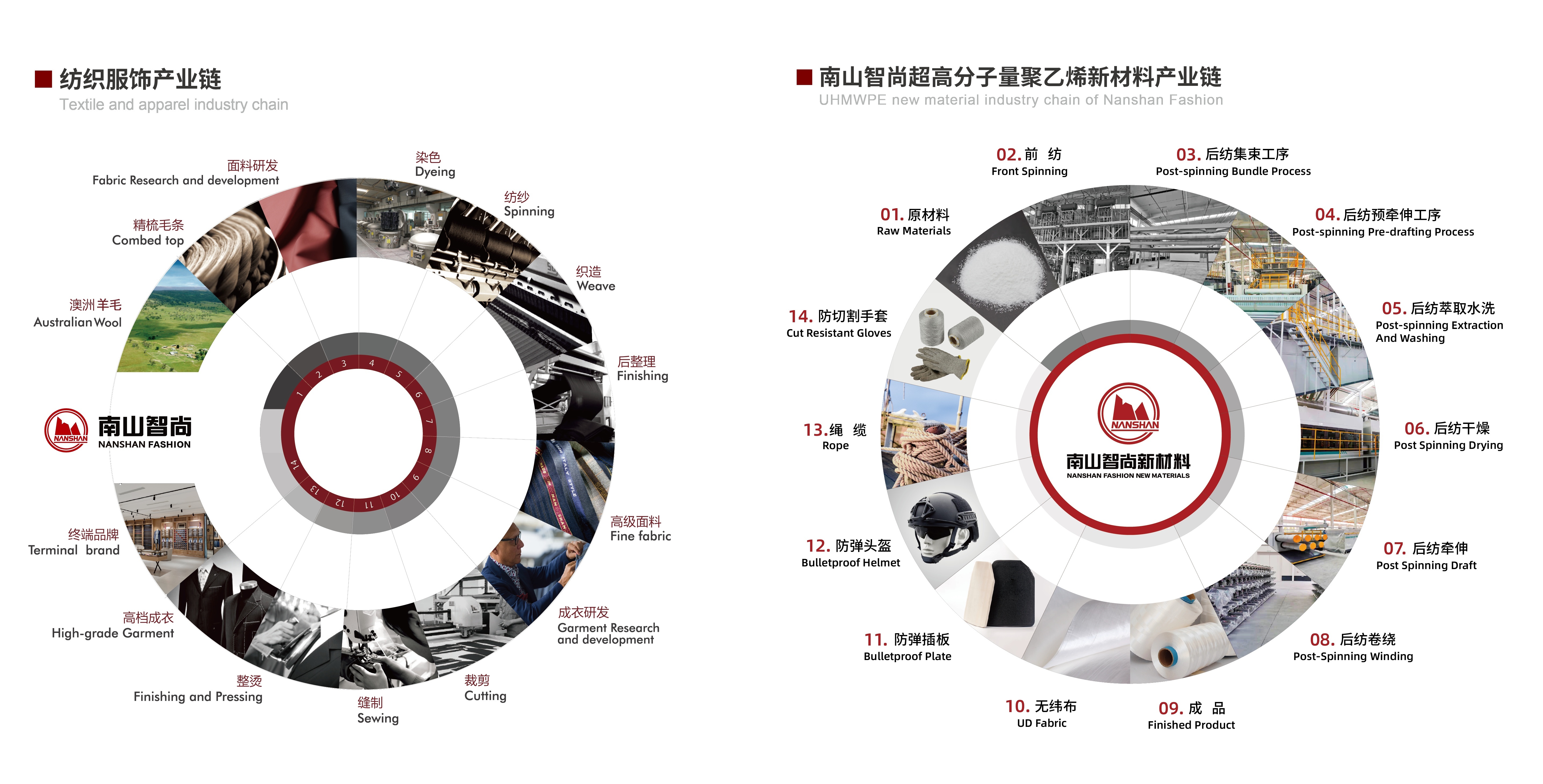 南山智尚着力打造“双链协同”发展体系,是全球为数不多的毛纺织服装产业链一体化公司,拥有从羊毛到成衣完整的毛纺织服饰产业链,公司同时建有3600吨超高分子量聚乙烯产业园区和8万吨高性能差别化锦纶产业园区。双链驱动下的南山智尚具有持续效益增长的超强壁垒优势,主营业务涵盖精纺呢绒、服装、新材料产品的研发、设计、生产与销售。